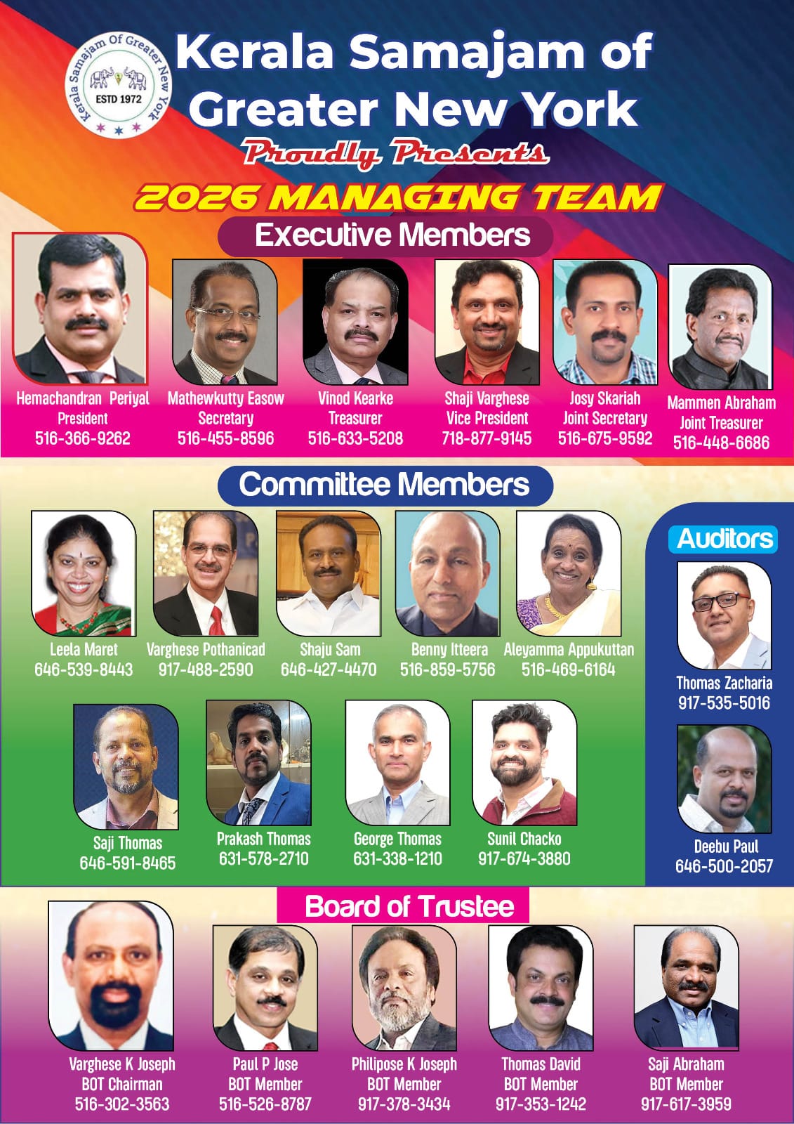 ന്യൂയോർക്ക്: അമേരിക്കയിലെ മലയാളീ സംഘടനകളുടെ മുത്തശ്ശി സംഘടന എന്നറിയപ്പെടുന്ന കേരളാ സമാജം ഓഫ് ഗ്രെയ്റ്റർ ന്യൂയോർക്കിൻറെ അൻപത്തിനാലാമത് വർഷത്തെ സാരഥ്യം ഏറ്റെടുക്കുന്നതിനായി നവ നേതൃത്വത്തെ വാർഷിക പൊതുയോഗം തെരഞ്ഞെടുത്തു. കഴിഞ്ഞ ശനിയാഴ്ച ഫ്ലോറൽ പാർക്കിലെ ടൈസൺ സെൻറർ ഓഡിറ്റോറിയത്തിൽ കൂടിയ വാർഷിക പൊതുയോഗത്തിൽ ഏകകണ്ഠമായാണ് പുതിയ ടീമിനെ തെരഞ്ഞെടുത്തത്. 2026-ലെ പ്രസിഡന്റായി ഹേമചന്ദ്രൻ പെരിയാൽ, സെക്രട്ടറിയായി മാത്യുക്കുട്ടി ഈശോ, ട്രഷററായി വിനോദ് കെആർക്കേ, വൈസ് പ്രസിഡന്റായി ഷാജി വർഗ്ഗീസ്, ജോയിന്റ് സെക്രട്ടറിയായി ജോസി സ്കറിയ, ജോയിന്റ് ട്രഷററായി മാമ്മൻ എബ്രഹാം എന്നിവരാണ് എതിരില്ലാതെ തെരഞ്ഞെടുക്കപ്പെട്ടത്. അതോടൊപ്പം തന്നെ ഒൻപത് കമ്മറ്റി അംഗങ്ങളും രണ്ട് ഓഡിറ്റർമാരും പുതിയ ഒരു ബോർഡ് ഓഫ് ട്രസ്റ്റീ അംഗവും തെരഞ്ഞെടുക്കപ്പെട്ടു.