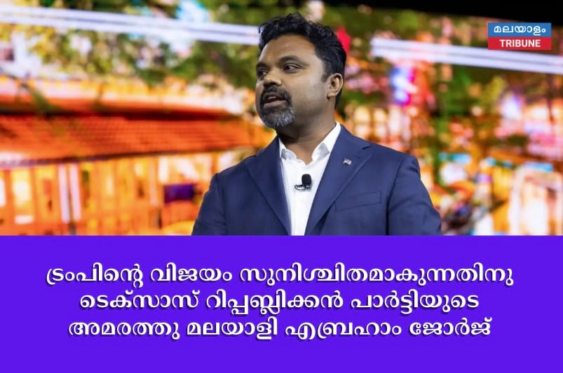 നവംബറിൽ നടക്കുന്ന അമേരിക്കൻ പ്രസിഡന്റ് തിരഞ്ഞെടുപ്പിൽ റിപ്പബ്ലിക്കൻ ഉരുക്കുകോട്ടയായി അറിയപ്പെടുന്ന ടെക്സാസ് സംസ്ഥാനത്തു ട്രംപിന്റെ വിജയം സുനിശ്ചിതമാക്കണമെന്ന ദ്രഢനിശ്ചയത്തോടെ പാർട്ടി അമരക്കാരനായ മലയാളി എബ്രഹാം ജോർജ് അരയും തലയും മുറുക്കി രംഗത്ത്.