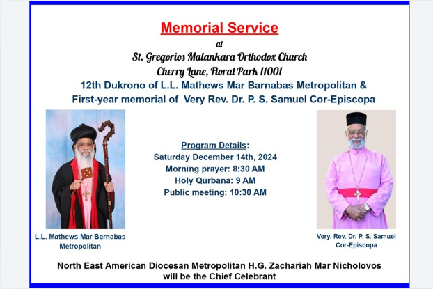 ന്യൂയോര്ക്ക്: മലങ്കര ഓർത്തഡോക്സ് സഭ അമേരിക്കൻ ഭദ്രാസനങ്ങളുടെ മെത്രാപ്പോലീത്തയായിരുന്ന ഭാഗ്യസ്മരണീയനായ മാത്യൂസ് മാർ ബർന്നബാസ് തിരുമേനിയുടെ (2012 ഡിസംബര് 9-ന് കാലം ചെയ്തു) 12-ാമത് ദുഖ്റോനയും, ചെറി ലെയിൻ ഓർത്തഡോക്സ് പള്ളിയുടെയും, അമേരിക്കയിലെ ഇതര ഇടവകകളുടെയും വികാരിയും സംഘാടകനുമായിരുന്ന വന്ദ്യ ഡോക്ടർ പി. എസ്. സാമുവൽ കോർ എപ്പിസ്കോപ്പയുടെ (2023 ഡിസംബര് 13-ന് ദിവംഗതനായി) ഒന്നാം ചരമവാർഷികവും സംയുക്തമായി കൊണ്ടാടുന്നു.