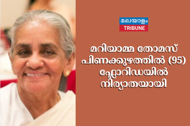 ഫ്ലോറിഡ: നീറിക്കാട് പരേതനായ പി.യു. തോമസിന്റെ ഭാര്യ മറിയാമ്മ തോമസ് പിണക്കുഴത്തില് (95) ഫ്ലോറിഡയില് നിര്യാതയായി. പരേത പേരൂര് പുളിക്കത്തൊടിയില് കുടുംബാംഗമാണ്.