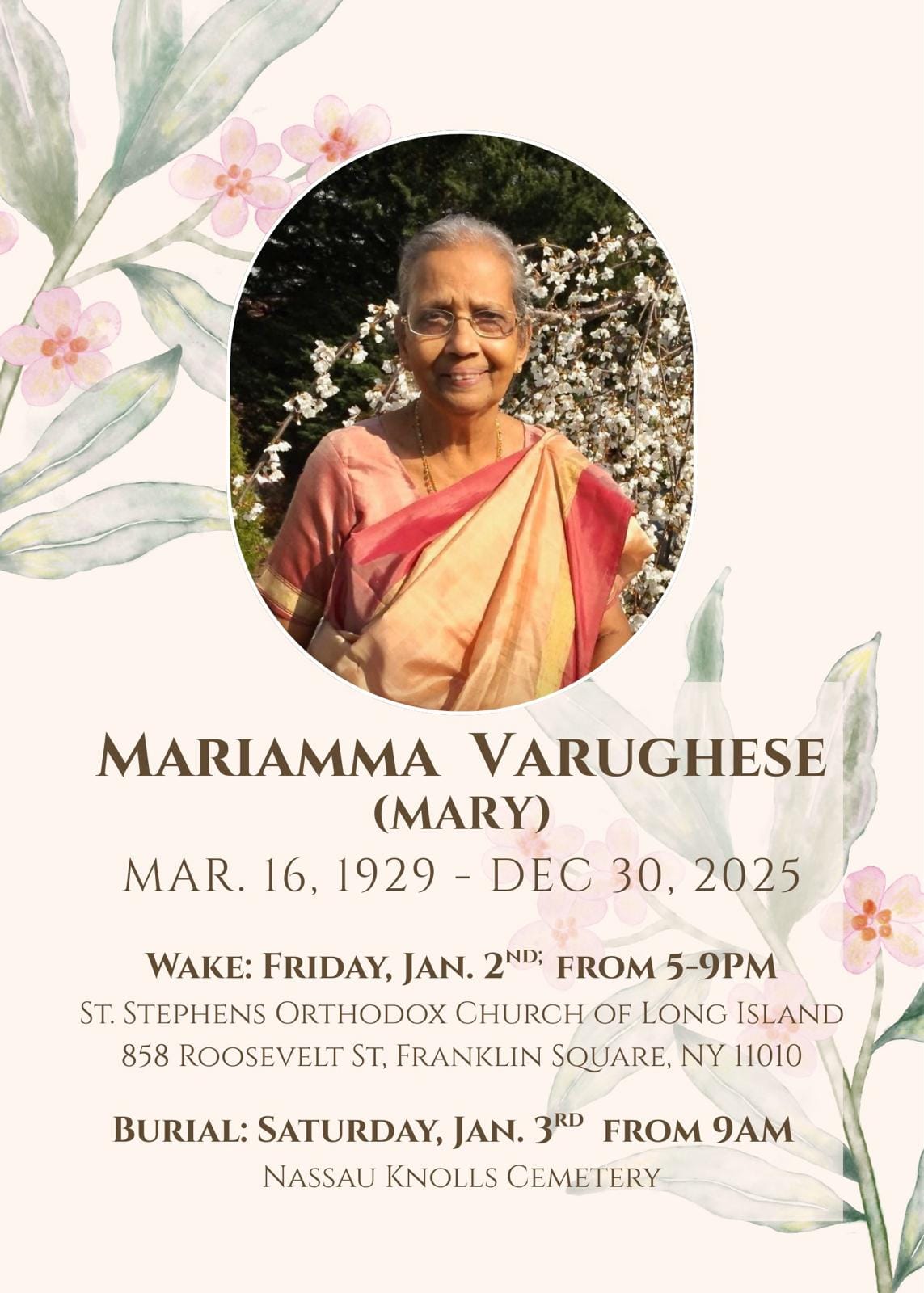 ജനുവരി 2 വെള്ളി വൈകിട്ട് 5 മുതൽ 9 വരെ സെൻറ് സ്റ്റീഫൻസ് ഓർത്തഡോക്സ് പള്ളിയിൽ (858 Roosevelt Street, Franklin Square, NY 11010) പൊതുദർശനത്തിന് ശേഷം 3 ശനിയാഴ്ച രാവിലെ 9-ന് നാസ്സോ നോൾസ് സെമിത്തേരിയിൻ സംസ്കാരവും നടത്തുന്നതാണ്.