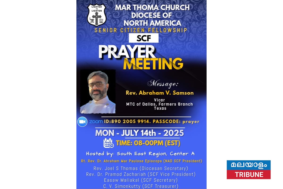 ന്യൂയോർക് :നോർത്ത്അ മേരിക്ക മാർത്തോമ്മാ ഭദ്രാസനം സീനിയർ സിറ്റിസൺ ഫെലോഷിപ്പിന്റെ ആഭിമുഖ്യത്തിൽ ജൂലൈ 14 ന് തിങ്കൾ രാത്രി 8-00 (ഇഎസ്ടി) സൂം പ്ലാറ്റഫോമിൽ പ്രയർ മീറ്റിംഗ് സംഘടിപ്പിക്കുന്നു മാർത്തോമാ ചര്ച്ച വികാരി (ഫാർമേഴ്സ് ബ്രാഞ്ച്) റവ. എബ്രഹാം വി സാംസൺ തോമസ്, മുഖ്യ സന്ദേശം നൽകും
