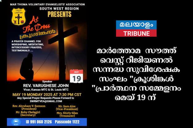 ഡാളസ് :മാർത്തോമ നോർത്ത് അമേരിക്ക ഭദ്രാസനം സൗത്ത് വെസ്റ്റ് റീജിയണൽ സന്നദ്ധ സുവിശേഷക സംഘം പ്രാർത്ഥന സമ്മേളനം " അറ്റ് ദി ക്രോസ്" "ക്രൂശിങ്കൾ "*മെയ് 19 തിങ്കളാഴ്ച 2025 വൈകുന്നേരം 7:30 ന് സൂം വഴി.സംഘടിപ്പിക്കുന്നു.റവ. വർഗീസ് ജോൺ*(വികാരി, കൻസാസ് MTC & സെന്റ് ലൂയിസ് എംടിസി) മുഖ്യ *സന്ദേശം നൽകും