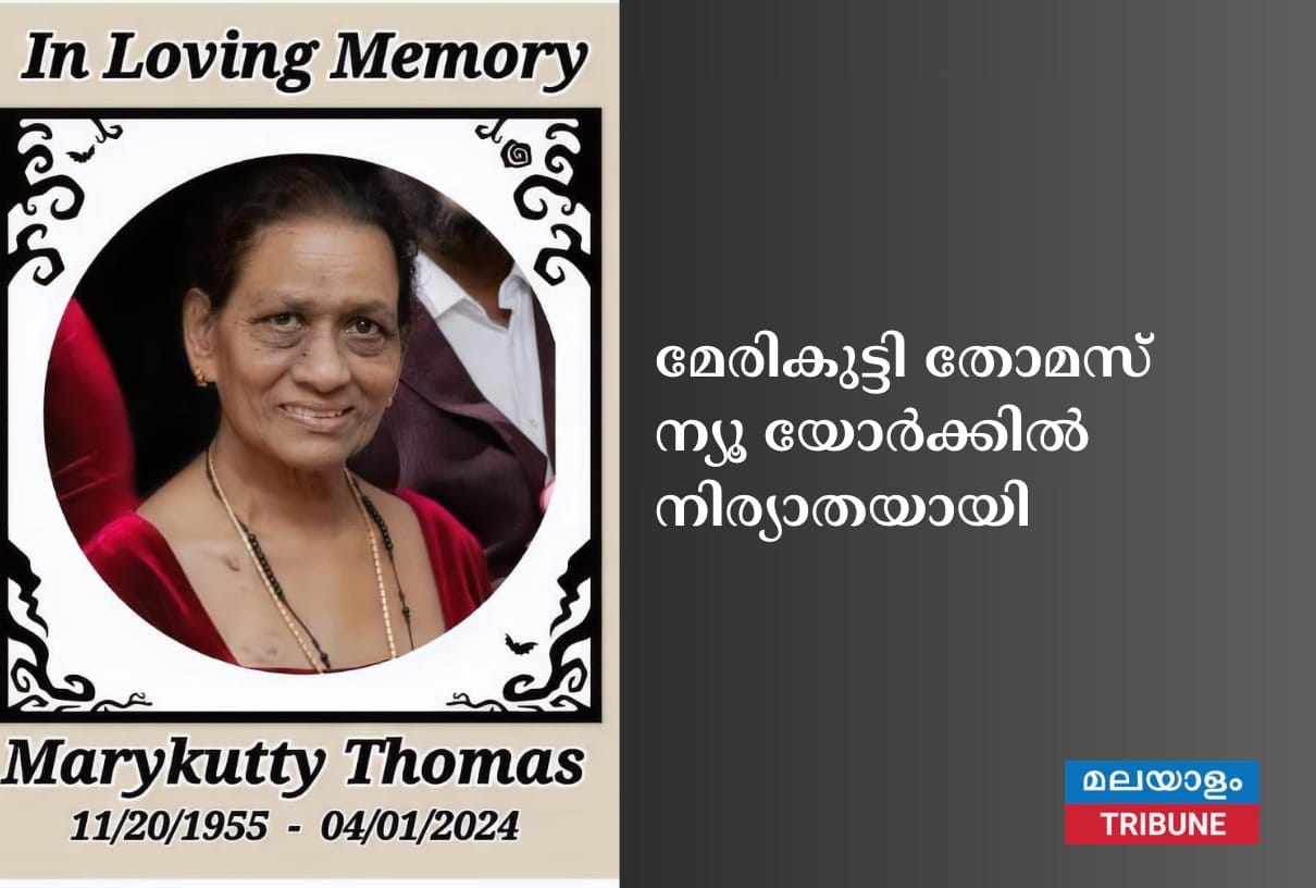 ന്യൂ യോർക്ക് : ന്യൂ യോർക്ക് , പോർട്ട്ചെസ്റ്റർ നിവാസിയും, അടൂർ കരുവാറ്റ പറങ്കിമാൻ വിളയിൽ തോമസ് ജോണിന്റെ (അനിയൻ ) ഭാര്യ മേരികുട്ടി തോമസ് (68 ) ന്യൂ യോർക്കിൽ നിര്യാതയായി. 25 വർഷമായി ന്യൂ യോർക്കിൽ താസിക്കുന്ന അവർ പോർട്ട്ചെസ്റ്റർ സെന്റ് ജോർജ് ഓർത്തഡോസ് ചർച്ചിന്റെ മെംബറും സജീവ പ്രവർത്തകയും വെസ്റ്റ്ചെസ്റ്റർ മലയാളീ അസോസിയേഷന്റെ സന്തത സഹചാരിയും ലൈഫ് മെംബറും ആണ് .