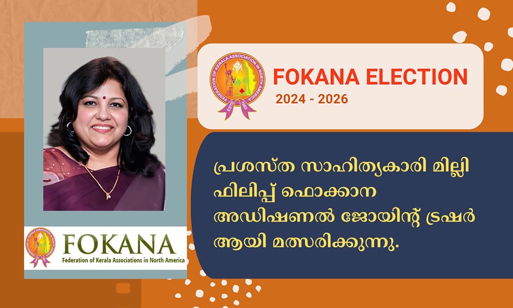 ഫൊക്കാനയുടെ 2024 -2026 വർഷത്തെ അഡിഷണൽ ജോയിന്റ് ട്രഷർ ആയി പ്രശസ്ത സാഹിത്യകാരിയും കലാ- സംസ്കാരിക പ്രവർത്തകയുമായ മില്ലി ഫിലിപ്പ് മത്സരിക്കുന്നു.