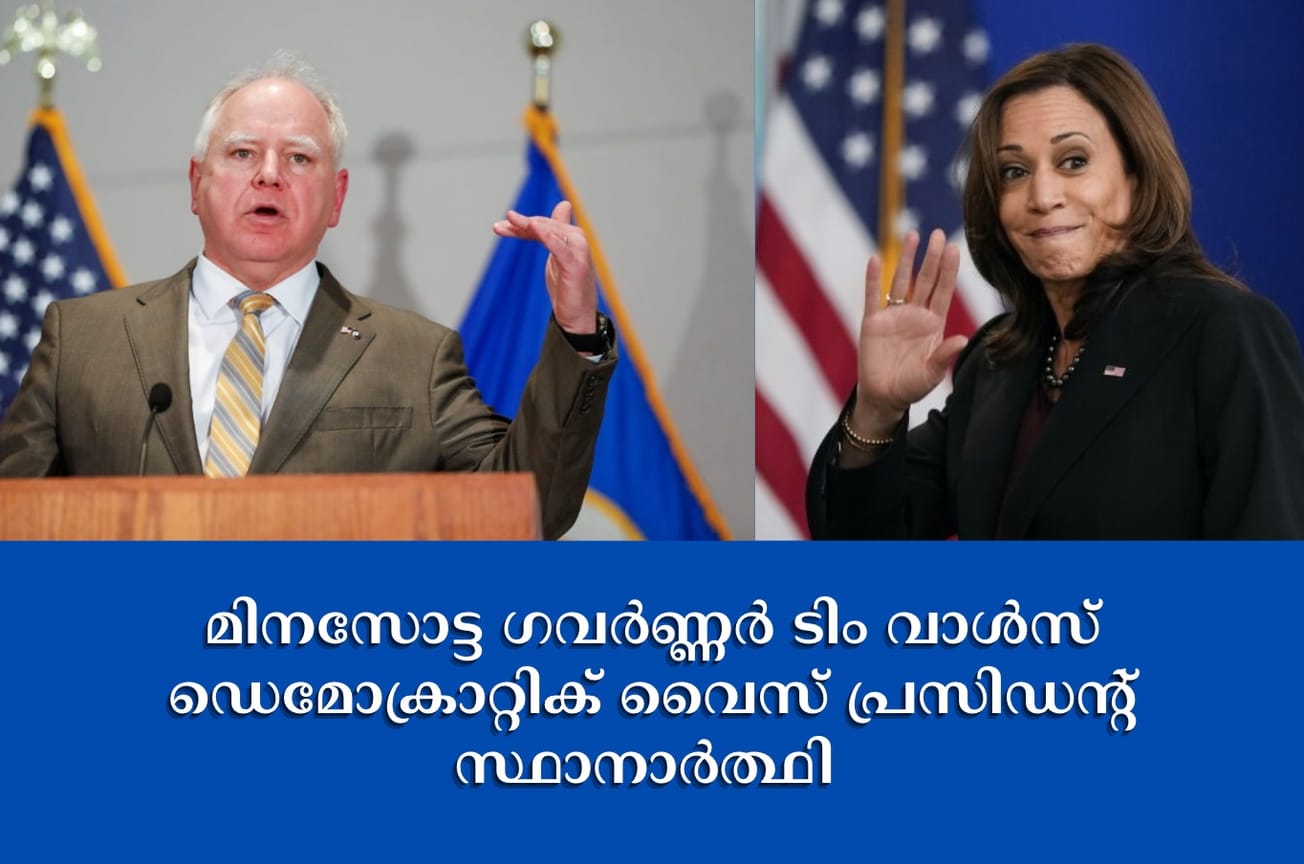 വാഷിംഗ്ടണ്: നീണ്ടു നിന്ന അനിശ്ചിതത്വത്തിനും ചർച്ചകൾക്കുമൊടുവിൽ ഡെമോക്രാറ്റിക് പ്രസിഡൻറ് സ്ഥാനർത്ഥി കമലാ ഹാരിസ് തന്റെ വൈസ് പ്രസിഡന്റ് സ്ഥാനർത്ഥിയായി മിനസോട്ട ഗവർണർ ടിം വാൾസിനെ തിരഞ്ഞെടുത്തു. നവംബർ 5 ന് നടക്കുന്ന പൊതു തിരെഞ്ഞെടുപ്പിൽ റിപ്പബ്ലിക്കൻമാരായ ഡൊണാൾഡ് ട്രംപിനും ജെഡി വാൻസിനും എതിരെ ഇരുവരും മത്സരിക്കും..