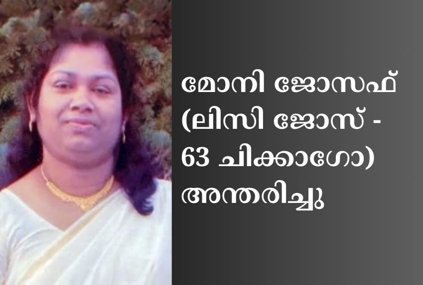 ചിക്കാഗോ: ആനിക്കാട് തെനിയപ്ലാക്കൽ ടി ജെ ജോസഫിന്റെ ഭാര്യ മോനി ജോസഫ് (ലിസി ജോസ് ,63) അന്തരിച്ചു. ഡിസ്പ്ലൈൻസ് ഹോളി ഫാമിലി നഴ്സിംഗ് ഹോമിൽ നഴ്സായി ദീർഘകാലം സേവനം ചെയ്തിരുന്നു.