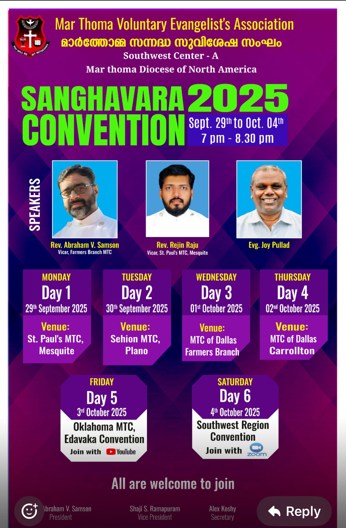 റവ. എബ്രഹാം വി. സാംസൺ,(വികാരി, ഫാർമേഴ്സ് ബ്രാഞ്ച് എംടിസി) ,റവ. റെജിൻ രാജു വികാരി, സെന്റ് പോൾസ് എംടിസി, മെസ്ക്വിറ്റ്,,ജോയ് പുല്ലാട് എന്നിവർ കൺവെൻഷനിൽ ,വചന ശുശ്രുഷ നിർവഹിക്കും എല്ലാവരെയും കൺവെൻഷനിലേക് സ്വാഗതം ചെയ്യുന്നതായി സംഘാടകർ റവ. എബ്രഹാം വി. സാംസൺ,ഷാജി സ് രാമപുരം , അലക്സ് കോശി എന്നിവർ അഭ്യർത്ഥിച്ചു