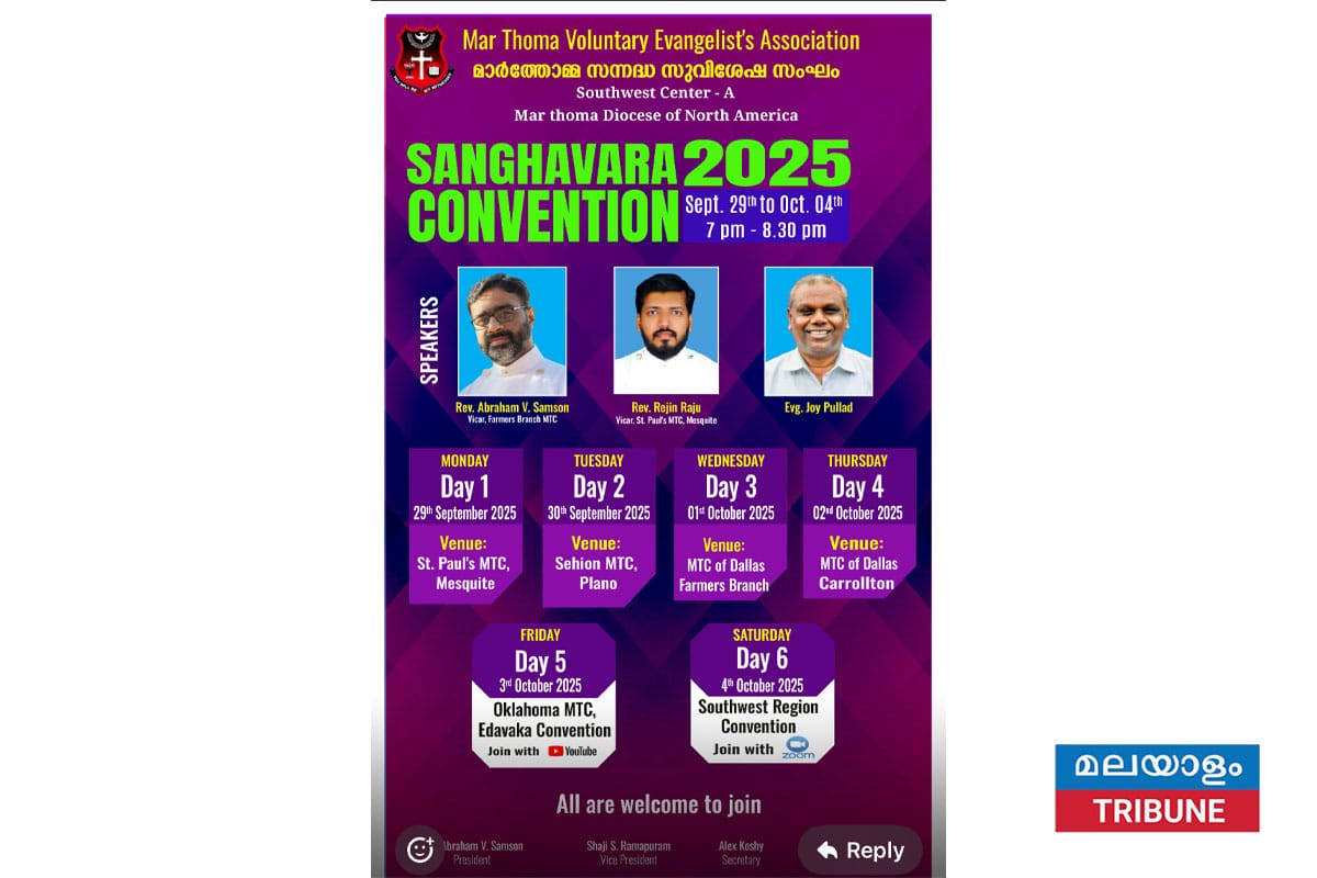 ഡാളസ്: നോർത്ത് അമേരിക്ക മാർത്തോമാ ഭദ്രാസന സന്നദ്ധ സുവിശേഷക സംഘവാര ത്തോടനുബന്ധിച്ചു സൗത്ത് വെസ്റ്റ് ഭദ്രാസന സെന്റര് എ സംഘവാര കൺവെൻഷൻ സെപ്റ്റംബർ 29 മുതൽ ഒക്ടോബർ 4 വരെ വൈകുന്നേരം 7 മുതൽ രാത്രി 8.30 വരെ ഡാളസ്, ഒക്കലഹോമ മാർതോമാ ദേവാലയങ്ങളിൽ വെച്ച് നടത്തപ്പെടുന്നു