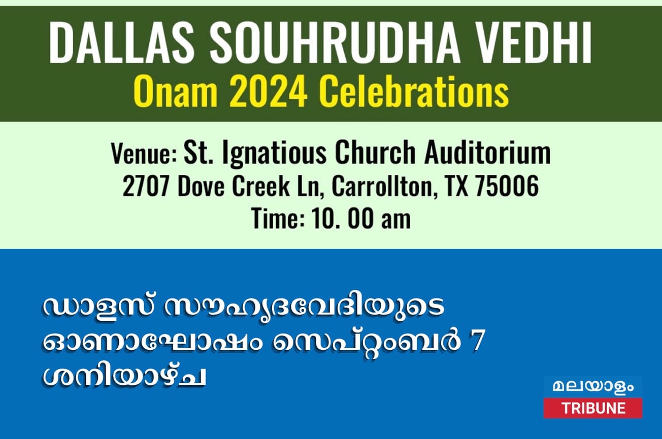 ഡാളസ് : ഡാളസിലെ സാമൂഹിക സാംസ്കാരിക സംഘടനയായ സൗഹൃദവേദിയുടെ പതിനൊന്നാമത് ഓണാഘോഷം വിവിധ പരിപാടികളോട് സെപ്റ്റംബർ 7 ശനിയാഴ്ച രാവിലെ 10 മണിക്ക് കരോൾട്ടൻ സെന്റ്. ഇഗ് നേഷ്യസ് ഓഡിറ്റോറിയത്തിൽ (2707 Dove Creek Ln, Carrollton, Tx 75006) വെച്ച് നടത്തപ്പെടും.