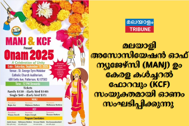 കേരളത്തിലെ ഏറ്റവും പ്രിയപ്പെട്ട സാംസ്കാരിക ഉത്സവമായ ഓണം 2025 ആഘോഷിക്കാൻ മലയാളി സമൂഹം ഒത്തുചേരുന്നു. മലയാളി അസോസിയേഷൻ ഓഫ് ന്യൂജേഴ്സി (MANJ) ഉം കേരള കൾച്ചറൽ ഫോറവും (KCF) സംയുക്തമായി സംഘടിപ്പിക്കുന്ന ഓണാ ഘോഷം സെപ്റ്റംബർ 13 ശനിയാഴ്ച ഉച്ചക്ക് പാറ്റേഴ്സണിലുള്ള സൈന്റ്റ് ജോർജ് സിറോ മലബാർ ചർച് ഓഡിറ്റോറിയത്തിൽ വച്ചു നടത്തപ്പെടും.
