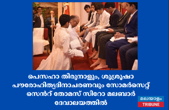 ന്യൂജേഴ്സി: അന്ത്യ അത്താഴത്തിനു മുമ്പ് യേശു ശിഷ്യരായ 12 പേരുടെയും കാലുകള് കഴുകി ചുംബിച്ചു. 'ഞാന് ചെയ്തതുപോലെ നിങ്ങളും ചെയ്യേണ്ടതിന് ഞാനിതാ നിങ്ങള്ക്ക് മാതൃകയാകുന്നു' എന്ന് രണ്ടായിരമാണ്ടുകള്ക്കപ്പുറം വിനയത്തിന്റെ മാതൃക കാണിച്ചു തന്ന യേശുവിന്റെ സ്മരണ പുതുക്കിയും, വിശുദ്ധ കുര്ബാന സ്ഥാപിച്ചതിന്റെ ഓര്മ്മ അനുസ്മരിച്ചും, സോമര്സെറ്റ് സെന്റ് തോമസ് സീറോ മലബാര് കാത്തലിക് ഫൊറോനാ ദേവാലയത്തില് ഈവര്ഷത്തെ പെസഹാ തിരുനാളും, ശുശ്രൂഷാ പൗരോഹിത്യദിനവും ആചരിച്ചു.