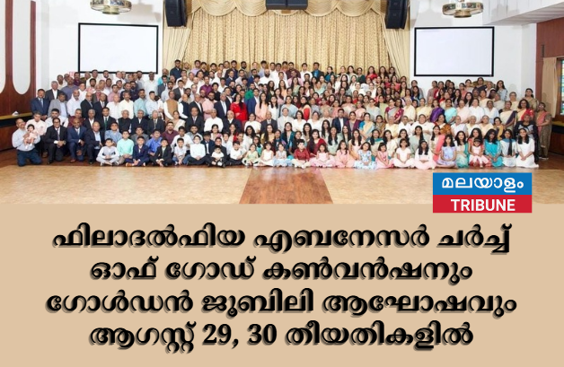 ഫിലദെൽഫിയ : എബനേസർ ചർച്ച് ഓഫ് ഗോഡ് കൺവൻഷനും ഗോൾഡൻ ജൂബിലി ആഘോഷവും ആഗസ്റ്റ് 29, 30 തീയതികളിൽ നടത്തപ്പെടും. 30 ശനിയാഴ്ച രാവിലെ ജൂബിലി സമ്മേളനം നടക്കും. സീനിയർ പാസ്റ്റർ രഞ്ജൻ പി. ചെറിയാൻ്റെ നേതൃത്വത്തിൽ ജൂബിലി കമ്മറ്റിയുടെ പ്രവർത്തനങ്ങൾ പുരോഗമിക്കുന്നു. ചാരിറ്റി, സുവനീർ, പബ്ളിസിറ്റി, പബ്ളിക് റിലേഷൻസ്, ഫെലോഷിപ്പ് തുടങ്ങിയ സബ്കമ്മറ്റികളും പ്രവർത്തിച്ചു വരുന്നു.