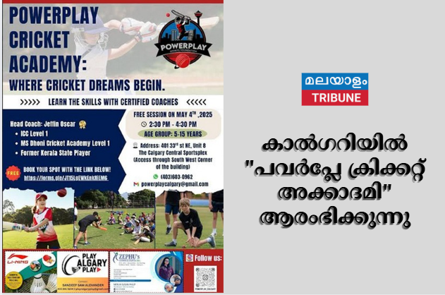 കാല്ഗറി: കാൽഗറി യിലെ ക്രിക്കറ്റ് പ്രേമികളായ ഒരുകൂട്ടം ചെറുപ്പക്കാർ രൂപം കൊടുത്ത "പവർപ്ലേ ക്രിക്കറ്റ് അക്കാദമി" മെയ് 04, 2025 നു ഉത്ഘാടനം ചെയ്യപ്പെടുന്നു . 5 മുതൽ 15 വയസ്സ് വരെ പ്രായമുള്ള കുട്ടികൾക്കായി ക്രിക്കറ്റ് കളി പഠിക്കാനും വളരാനും രസകരവും ഘടനാപരവുമായ അന്തരീക്ഷം ഈ അക്കാദമി വാഗ്ദാനം ചെയ്യുന്നു.