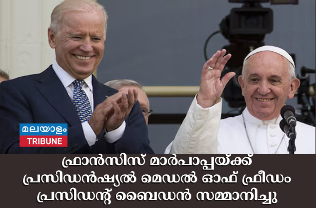 വാഷിംഗ്ടൺ : ഫ്രാൻസിസ് മാർപ്പാപ്പയ്ക്ക് ബൈഡൻ പ്രസിഡൻഷ്യൽ മെഡൽ ഓഫ് ഫ്രീഡം നൽകി ആദരിച്ചു.അദ്ദേഹം ഇതുവരെ നൽകിയിട്ടുള്ള ഒരേയൊരു പ്രസിഡൻഷ്യൽ മെഡൽ ഓഫ് ഫ്രീഡം ആണിത്.
