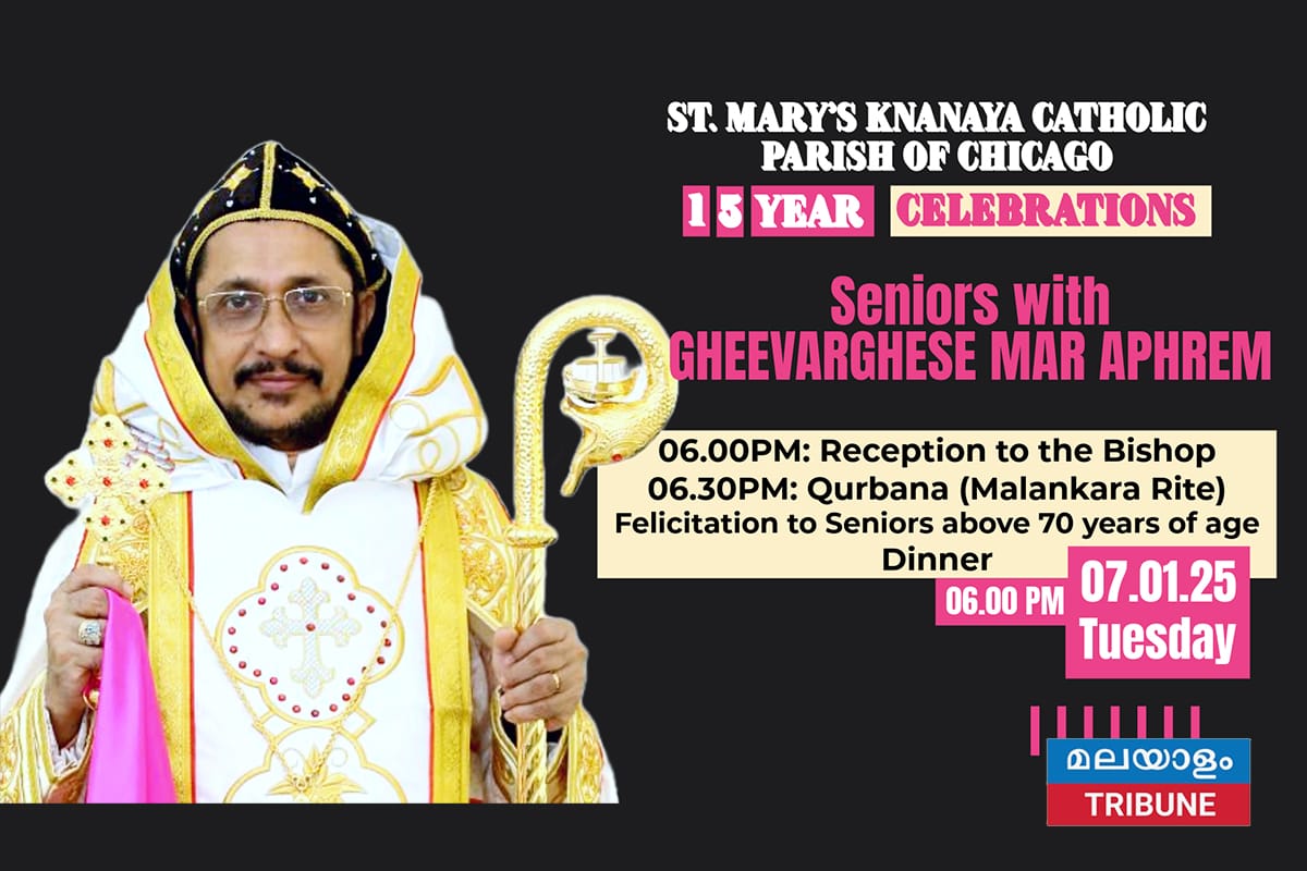 ചിക്കാഗോ: ചിക്കാഗോ സെന്റ് മേരീസ് ക്നാനായ കത്തോലിക്കാ ഇടവകയുടെ പതിനഞ്ചാം വാർഷികത്തിന്റെ ഭാഗമായി കോട്ടയം അതിരൂപതാ സഹായ മെത്രാനും കോട്ടയം അതിരൂപതയിലെ പ്രഥമ മലങ്കര റീത്തിലെ മെത്രാനും കൂടിയായ ഗീവർഗീസ് മാർ അപ്രേം പിതാവിന് സ്വീകരണവും ഇടവകയിലെ മുതിർന്ന ഇടവകാംഗങ്ങളുടെ സംഗമവും നടത്തപ്പെടുന്നു. ജൂലൈ 1 ചൊവ്വാഴ്ച്ച വൈകുന്നേരമാണ് പരിപാടികൾ സംഘടിപ്പിക്കപ്പെടുന്നത്. വൈകിട്ട് 6 മണിക്ക് ഇടവകയിൽ എത്തുന്ന പിതാവിനെ ഇടവക വികാരി ഫാ. സിജു മുടക്കോടിലിന്റെ നേതൃത്വത്തിൽ സ്വീകരിച്ചാനയിക്കും. തുടർന്ന് മലങ്കര റീത്തിൽ അഭിവന്ദ്യ പിതാവ് വിശുദ്ധ കുർബ്ബാന അർപ്പിക്കും. 70 വയസ്സിന് മുകളിൽ ഉള്ള ഇടവകാംഗങ്ങളുടെ സംഗമം ആഘോഷങ്ങളുടെ ഭാഗമായി വിശുദ്ധ കുർബ്ബാനയ്ക്ക് ശേഷം നടത്തപ്പെടും. 70 വയസ്സിന് മുകളിൽ പ്രായമായവർക്കായി പ്രത്യേക അനുഗ്രഹ പ്രാർത്ഥനയും അവരെ ആദരിക്കുകയും ചെയ്യും. വികാരി. ഫാ. സിജു മുടക്കോടിൽ, അസി. വികാരി ഫാ. അനീഷ് മാവേലിപുത്തെൻപുര, സെക്രട്ടറി സിസ്റ്റർ ഷാലോം കൈക്കാരന്മാരായ സാബു കട്ടപ്പുറം, ബിനു പൂത്തുറയിൽ, ലൂക്കോസ് പൂഴിക്കുന്നേൽ, ജോർജ്ജ് മറ്റത്തിപ്പറമ്പിൽ, നിബിൻ വെട്ടിക്കാട്ട്, സണ്ണി മേലേടം, ബിനു കൈതക്കത്തൊട്ടിയുടെ നേതൃത്വത്തിലുള്ള പതിനഞ്ചാം വാർഷിക കമ്മറ്റിയംഗങ്ങൾ എന്നിവർ പരിപാടിക്ക് നേതൃത്വം നൽകും.