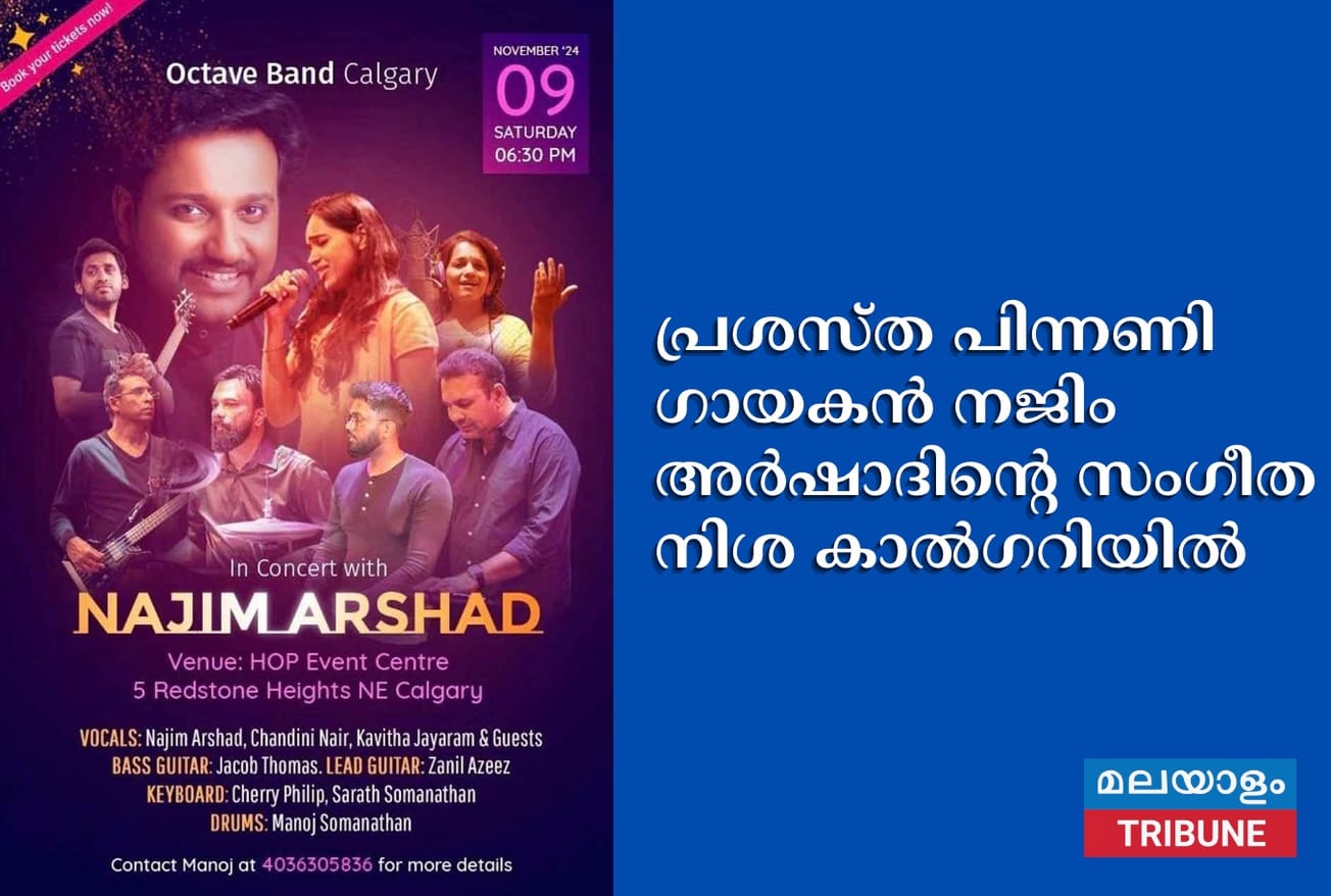 കാൽഗറി: പ്രശസ്ത പിന്നണി ഗായകനും സംസ്ഥാന അവാർഡ് ജേതാവുമായ നജിം അർഷാദിൻറെ സംഗീത നിശക്കായി കാൽഗറി ഒരുങ്ങുന്നു . നവംബർ ഒൻപതാം തീയതി ശനിയാഴ്ച 6.30നു HOP സെന്ററിൽ വച്ചാണ് പരിപാടി നടക്കുന്നത് . മലയാളം, തമിഴ്, ഹിന്ദി ഗാനങ്ങളാൽ ശ്രദ്ധേയമാകുന്ന ഈ സംഗീത പരിപാടി സംഘടിപ്പിക്കുന്നത് കാൽഗരി ആസ്ഥാനമായ ഒക്ടവ് ബാൻഡ് ആണ്.