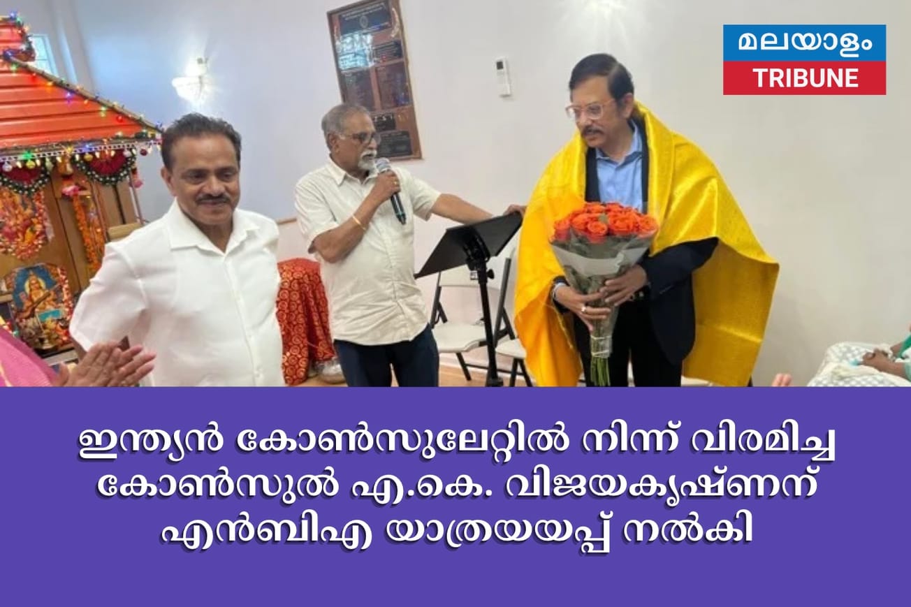 ന്യൂയോര്ക്ക്: കഴിഞ്ഞ അഞ്ചു വർഷം സ്തുത്യർഹമായ സേവനമനുഷ്ഠിച്ചതിനു ശേഷം നാട്ടിലേക്ക് മടങ്ങുന്ന ന്യൂയോര്ക്ക് ഇന്ത്യന് കോണ്സുലേറ്റിലെ കോണ്സുല് (കമ്മ്യൂണിറ്റി അഫയേഴ്സ്) എ കെ വിജയകൃഷ്ണനും സഹധർമ്മിണി ജലജാ വിജയകൃഷ്ണനും നായർ ബനവലന്റ് അസ്സോസിയേഷൻ (എന് ബി എ) ക്വീൻസിലുള്ള എൻ.ബി.എ. സെന്ററിൽ വച്ച് യാത്രയയപ്പ് നൽകി.