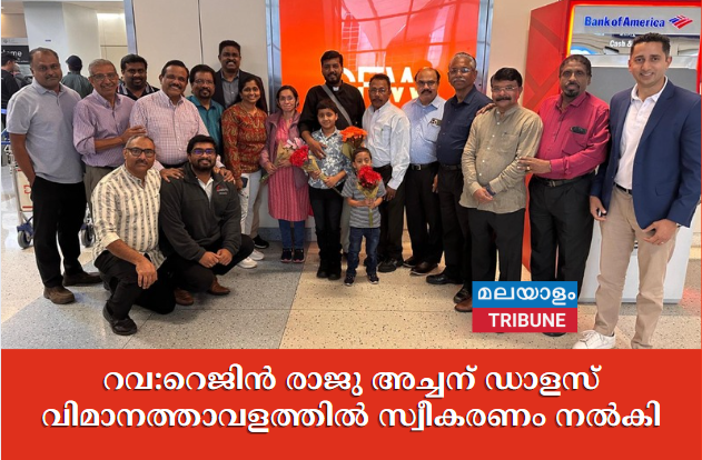 ഡാളസ് :ഡാളസ് സെന്റ് പോൾസ് മാർത്തോമാ ഇടവക വികാരിയായി ചുമതലയേൽക്കുന്നതിനു മെയ് ആറ് വൈകീട്ട് ഡാളസിൽ എത്തിച്ചേർന്ന റവ. റെജിൻ രാജു അച്ചനും കുടുംബത്തിനും ഡിഎഫ്ഡബ്ല്യു വിമാനത്താവളത്തിൽ ഊഷ്മള സ്വീകരണം നൽകി .