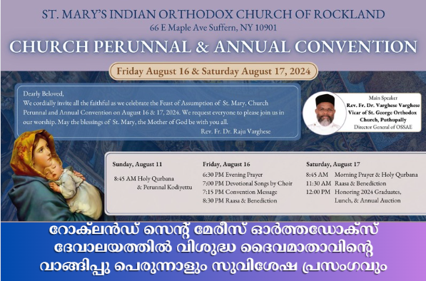 റോക്ലന്ഡ് സെന്റ് മേരീസ് ഓര്ത്തഡോക്സ് ദേവാലയത്തില് വിശുദ്ധ ദൈവമാതാവിന്റെ വാങ്ങിപ്പു പെരുന്നാളും സുവിശേഷ പ്രസംഗവും