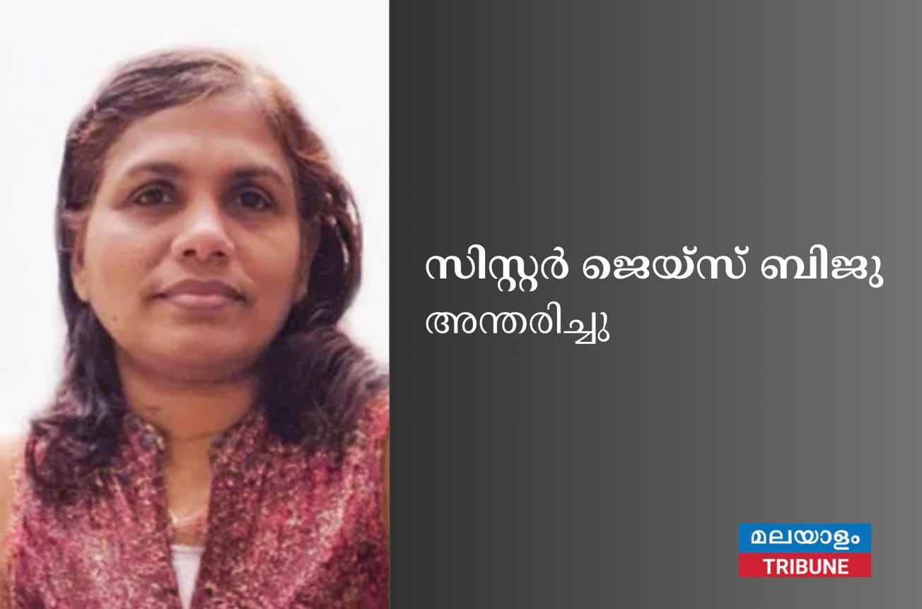 ഫിലാഡൽഫിയ: ഫിലാഡൽഫിയ ഇമ്മാനുവേൽ ഐപിസി മെമ്പർ ബ്ര. ബിജു മാർക്കോസിന്റെ ഭാര്യ സിസ്റ്റർ ജെയ്സ് ബിജു (51), മെയ് 03 ന് അന്തരിച്ചു. മക്കൾ: ജാക്ക് , ഷോൺ, ഡാനി.
