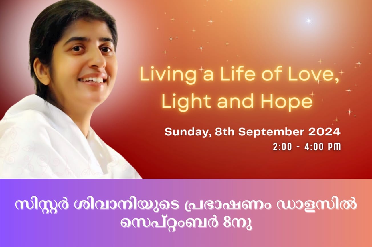 ഡാളസ് :സിസ്റ്റർ ശിവാനി സെപ്റ്റംബർ 8നു ഡാളസിൽ "സ്നേഹത്തിൻ്റെയും വെളിച്ചത്തിൻ്റെയും പ്രതീക്ഷയുടെയും ജീവിതം നയിക്കുന്നു"എന്ന വിഷയത്തെകുറിച്ചു പ്രഭാഷണം നടത്തുന്നു .