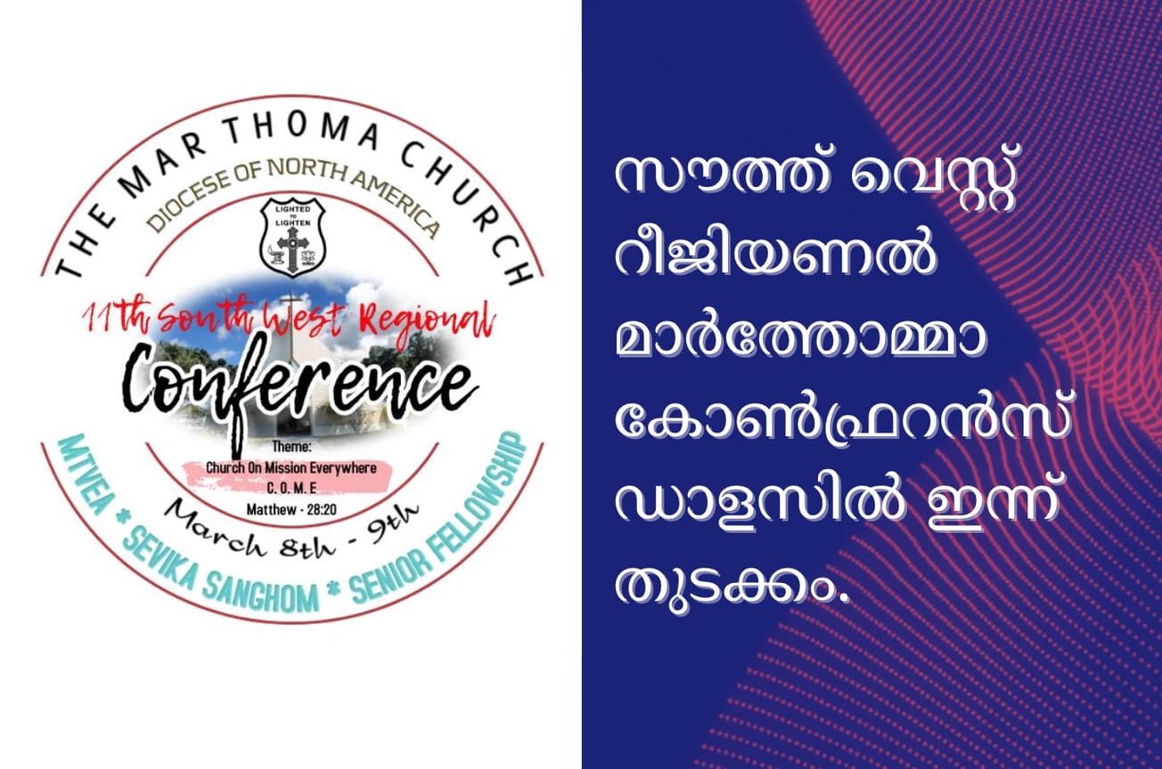 ഇന്ന് (വെള്ളി) വൈകിട്ട് 3 മണിക്ക് ഡാളസ് ഫാർമേഴ്സ് ബ്രാഞ്ച് മാര്ത്തോമ്മാ ദേവാലയത്തില് (11550 Luna Rd, Farmers Branch, Tx 75234) വെച്ച് തുടക്കം കുറിക്കുന്ന സൗത്ത് വെസ്റ്റ് റീജിയണല് മാര്ത്തോമ്മാ കോണ്ഫ്രറന്സ് നാളെ (ശനി) ഉച്ചക്ക് 2 മണിക്ക് സമാപിക്കും.