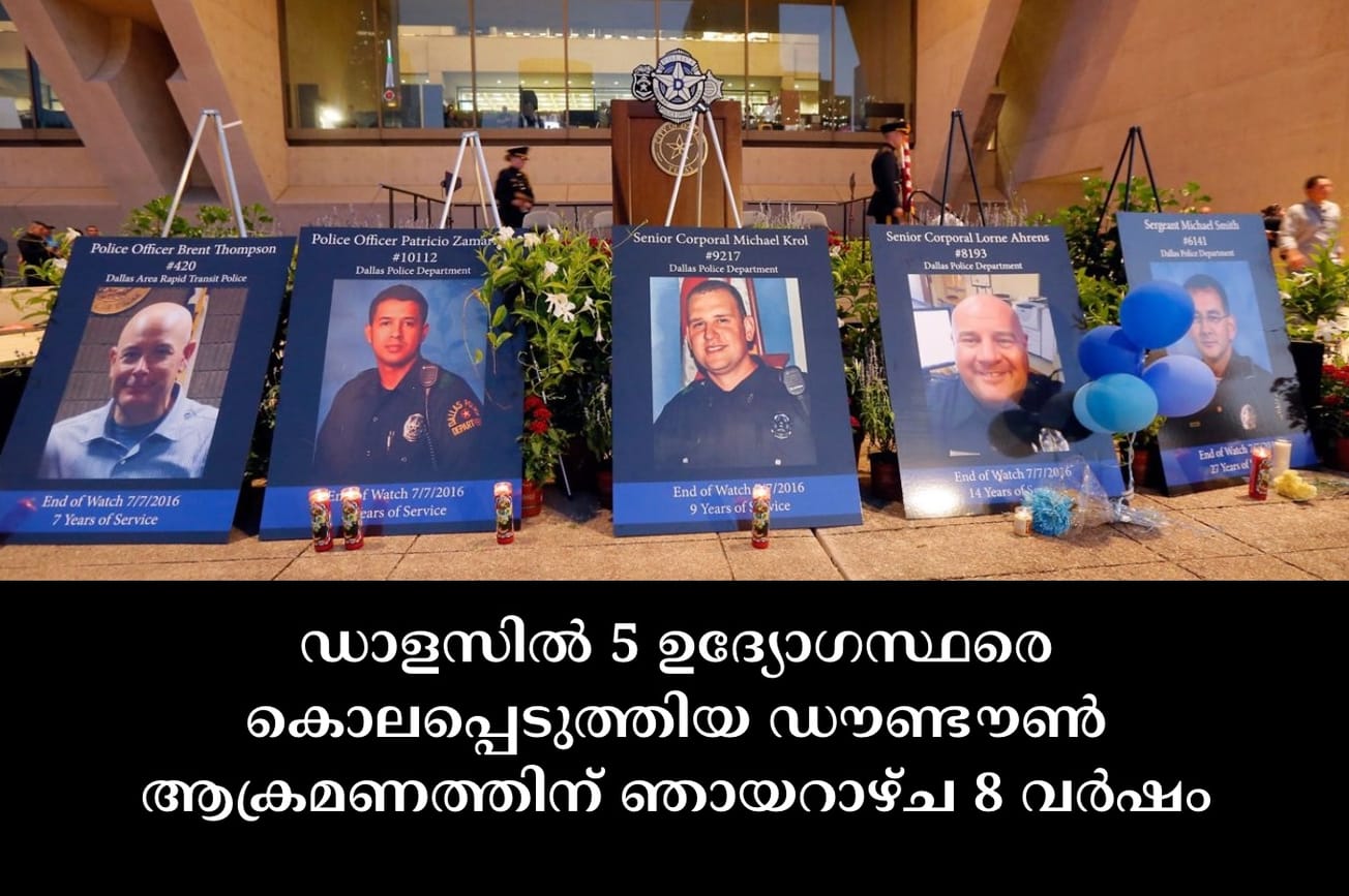 ഡാലസ് - അഞ്ച് പോലീസ് ഉദ്യോഗസ്ഥരെ കൊലപ്പെടുത്തിയ ഡൗണ്ടൗൺ ഡാളസിൽ പതിയിരുന്ന് ആക്രമണം നടന്നിട്ട് ഞായറാഴ്ച എട്ട് വർഷം തികയുന്നു.2016 ജൂലൈയിൽ ബ്ലാക്ക് ലൈവ്സ് മാറ്റർ പ്രതിഷേധത്തിനിടെയാണ് വെടിവയ്പ്പ് നടന്നത്.