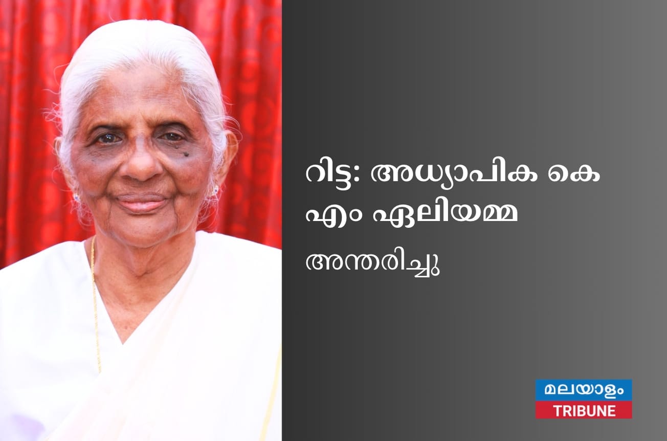 ഡാളസ്/ തിരുവല്ല : പരേതനായ കെ സി ജോർജിന്റെ ഭാര്യ റിട്ടയേർഡ് അധ്യാപിക ചാത്തമല വെട്ടുചിറയിൽ കൊച്ചുപറമ്പിൽ കെ എം ഏലിയമ്മ (95 ) മെയ് 7നു രാവിലെ നിര്യാതനായി . കിഴക്കും മുറി കണ്ടത്തിൽ കുടുംബാംഗമാണ് .സെന്റ് പോൾസ് ഓർത്തഡോക്സ് ചർച്ച (മെക്കിനി,ഡാളസ്) അംഗം സൂസൻ കുര്യാക്കോസിൻ്റെ മാതാവാണ് പരേത. അമേരിക്കയിൽ ധാരാളം സുഹൃദ് ബന്ധങ്ങളുള്ള ടീച്ചർ കെ എം ഏലിയമ്മ നിരവധി തവണ സന്ദർശനം നടത്തിയിട്ടുണ്ട്.കേരളത്തിൽ വിശ്രമ ജീവിതം നയിക്കുകയായിരുന്നു