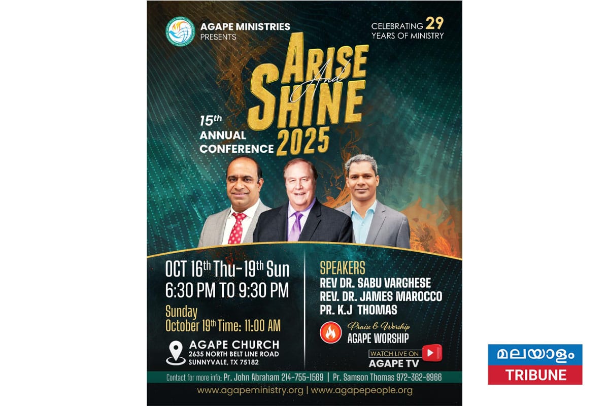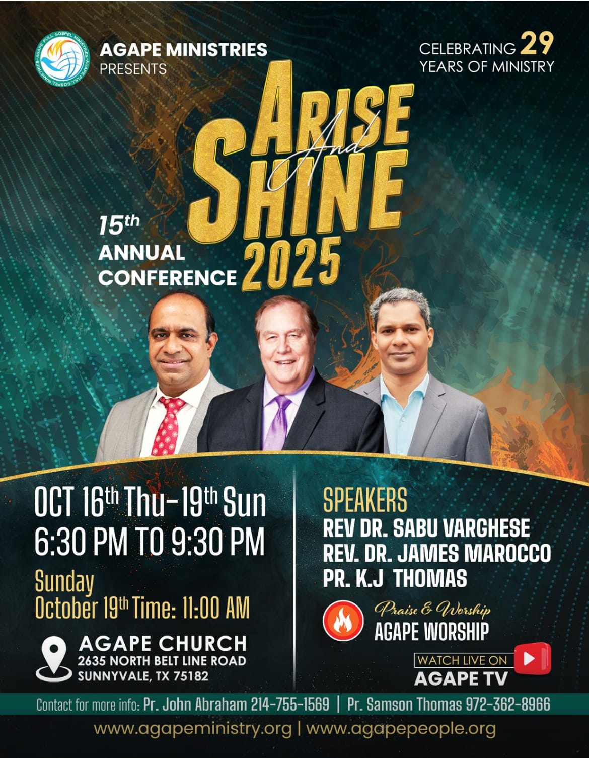 സണ്ണിവെയ്ൽ (ഡാലസ്) : ക്രിസ്തീയ ആത്മീയതക്കും നവീകരണത്തിനുമായി അമേരിക്കയിലെ അഗാപെ മിനിസ്ട്രീസ് സംഘടിപ്പിക്കുന്ന 15-ാമത് വാർഷിക സമ്മേളനം "അറൈസ് ആൻഡ് ഷൈൻ 2025" ഒക്ടോബർ 16 മുതൽ 19 വരെ സണ്ണിവേലിലെ അഗാപെ ചർച്ചിൽ നടക്കും.