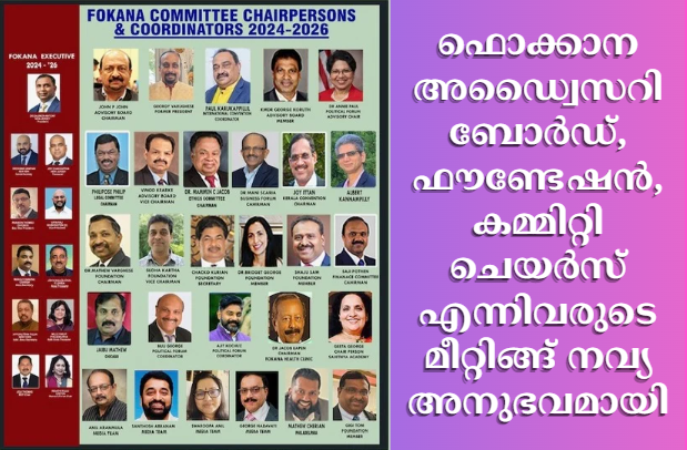 ന്യൂ യോർക്ക് : ഫൊക്കാനയുടെ അഡ്വൈസറി ബോർഡ്, ഫൗണ്ടേഷൻ , കമ്മിറ്റി ചെയർസ് എന്നിവരുടെ മീറ്റിങ്ങ് ഫൊക്കാന പ്രവർത്തനത്തിൽ നവ്യഅനുഭവമായി. ഈ കമ്മിറ്റികളിൽ ഉള്ളത് ഫൊക്കാനയുടെ സീനിയർ മെംബേർസ് ആണ്. അവരുടെ മീറ്റിംഗ് കൂടുകയും അവരുടെ അഭിപ്രായങ്ങൾ തേടുകയും ആ അഭിപ്രായങ്ങളെ ക്രോഡീകരിച്ചുകൊണ്ടു ഫൊക്കാനയുടെ പ്രവർത്തനത്തിൽ മാറ്റം വരുത്താനുമുള്ള പ്രസിഡന്റ് സജിമോൻ ആന്റണിയുടെ നേത്രത്വത്തിൽ ഉള്ള എക്സിക്യൂട്ടീവ് കമ്മിറ്റിയുടെ തീരുമാനത്തെ ഫൊക്കാനയുടെ സീനിയർ നേതാക്കൾ ഐക്യഖണ്ഡേന പ്രശംസിച്ചു. ഫൊക്കാനയുടെ ചരിത്രത്തിൽ ആദ്യമായാണ് ഇങ്ങനെ ഒരു മീറ്റിങ് സംഘടിപിച്ചതെന്ന് ഏവരും അഭിപ്രയപെട്ടു.