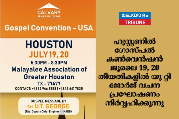 ഹൂസ്റ്റൺ : കാൽവരി പ്രയർ ഫെല്ലോഷിപ്പ് ഹൂസ്റ്റണിൽ ജൂലൈ 19 ,20 തീയതികളിൽ വൈകീട്ട് 5 ;30 സംഘടിപ്പിക്കുന്ന ഗോസ്പൽ കൺവെൻഷനിൽ പ്രശസ്ത സുവിശേഷ പ്രസംഗീകൻ യു റ്റി ജോർജ് (റിട്ടയേർഡ് ചീഫ് എഞ്ചിനീയർ കേരള വൈദുത ബോർഡ്) വചന പ്രഘോഷണം നിർവ്വഹിക്കുന്നു. മലയാളി അസോസിയേഷൻ ഓഫ് ഗ്രേറ്റർ ഹൂസ്റ്റൺ ഓഡിറ്റോറിയത്തിലാണ് സുവിശേഷ പ്രഘോഷണം സംഘടിപ്പിച്ചിരിക്കുന്നത് .എല്ലാവരെയും ക്ഷണിക്കുന്നതായി സംഘാടകർ അറിയിച്ചു.