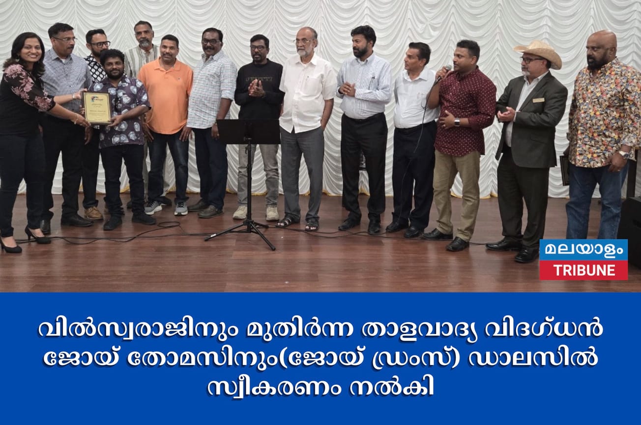 ഡാളസ് : കേരളത്തിൽ നിന്നും ആദ്യമായി അമേരിക്കയിൽ എത്തിച്ചേർന്ന പ്രശസ്ത പിന്നണി ഗായകൻ വിൽസ്വരാജിനും ,യു കെയിൽ നിന്നും എത്തിച്ചേർന്ന മുതിർന്ന താളവാദ്യ വിദഗ്ധൻ ജോയ് തോമസിനും(ജോയ് ഡ്രംസ്) ഡാലസിൽ ഊഷ്മള സ്വീകരണം നൽകി