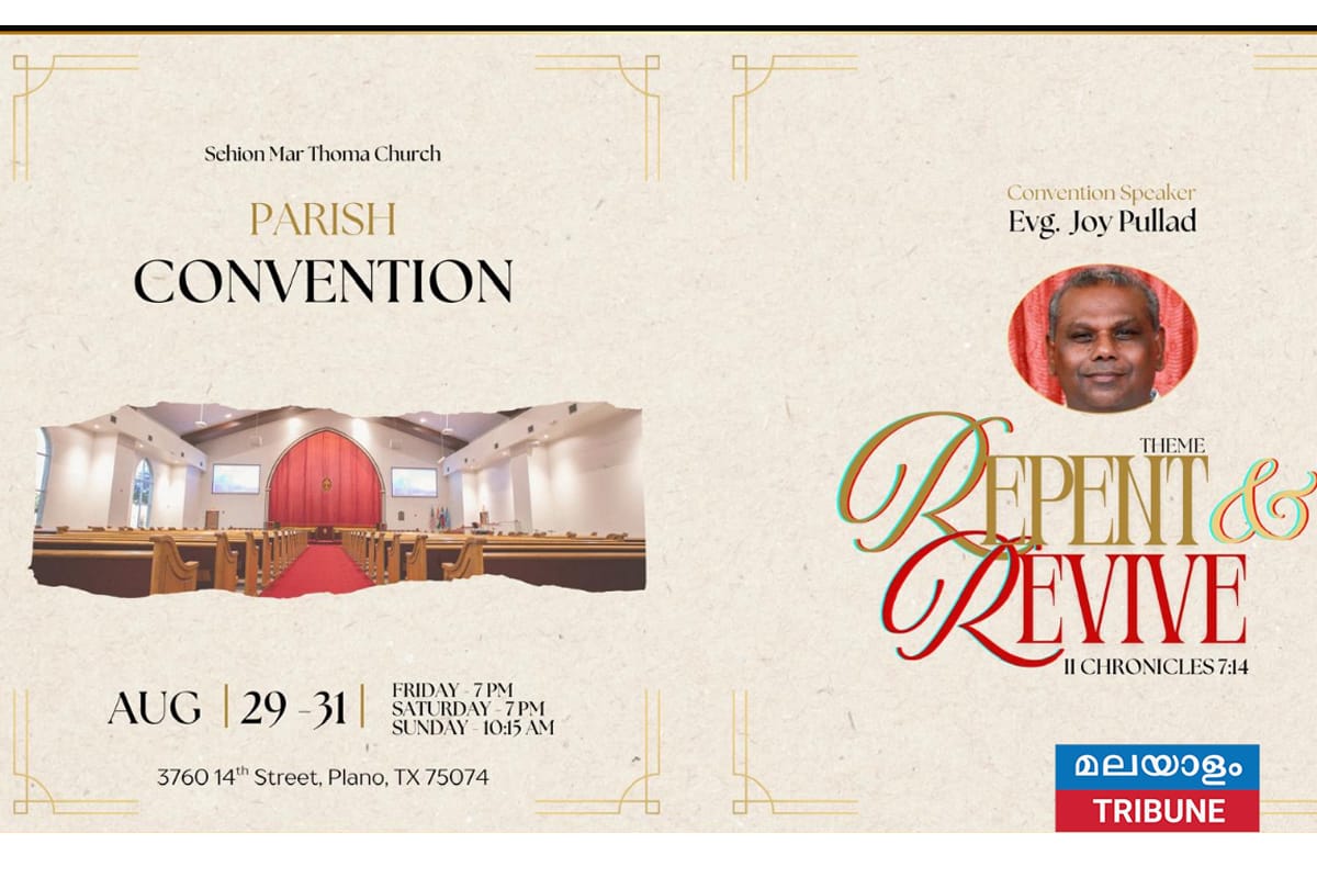 പ്ലാനോ(ഡാലസ്) : സെഹിയോൻ മാർത്തോമ ചർച്ച് പാരിഷ് കൺവെൻഷൻ ഓഗസ്റ്റ് 29 മുതൽ 31 വരെ നടത്തപ്പെടുന്നു ഇവാഞ്ചലിസ്റ്റ് ജോയ് പുല്ലാട് കൺവെൻഷനിൽ മുഖ്യാതിഥിയായി പങ്കെടുത്ത് വചന ശുശ്രൂഷ നിർവഹിക്കും